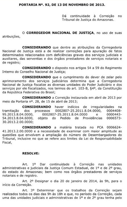 Na portaria nº 92, publicada no último dia 13 deste mês e assinada pelo ministro Francisco Falcão, é determinado que seja expedido oficio a Ordem dos Advogados do Brasil – Seção Amazonas e a Procuradoria Geral de Justiça do Amazonas, para acompanharam os trabalhos da correição. 20 de Janeiro de 2014 é a data para a continuidade\da correição pelo cnj.